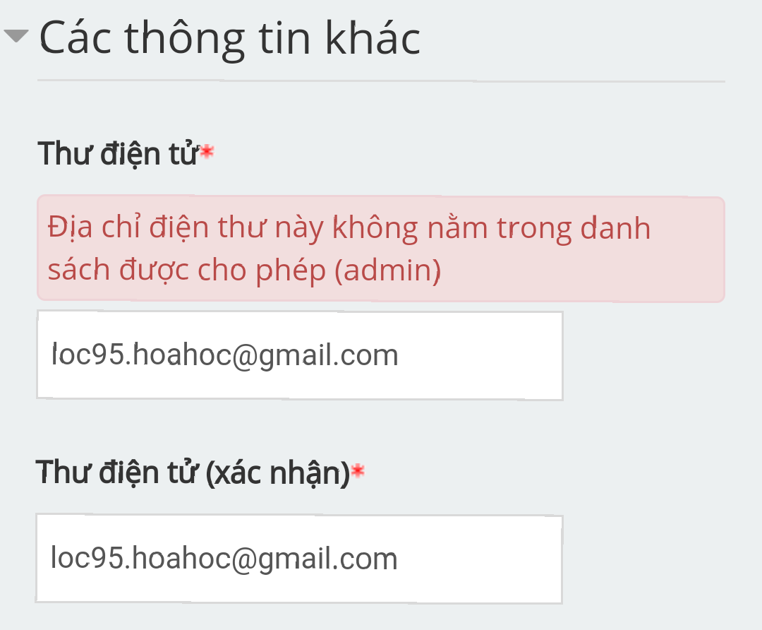 Khi học viên vào tạo tài khoản thì ở mục thư điện tử bị lỗi và nó báo như ảnh ạ