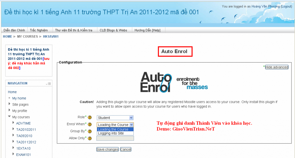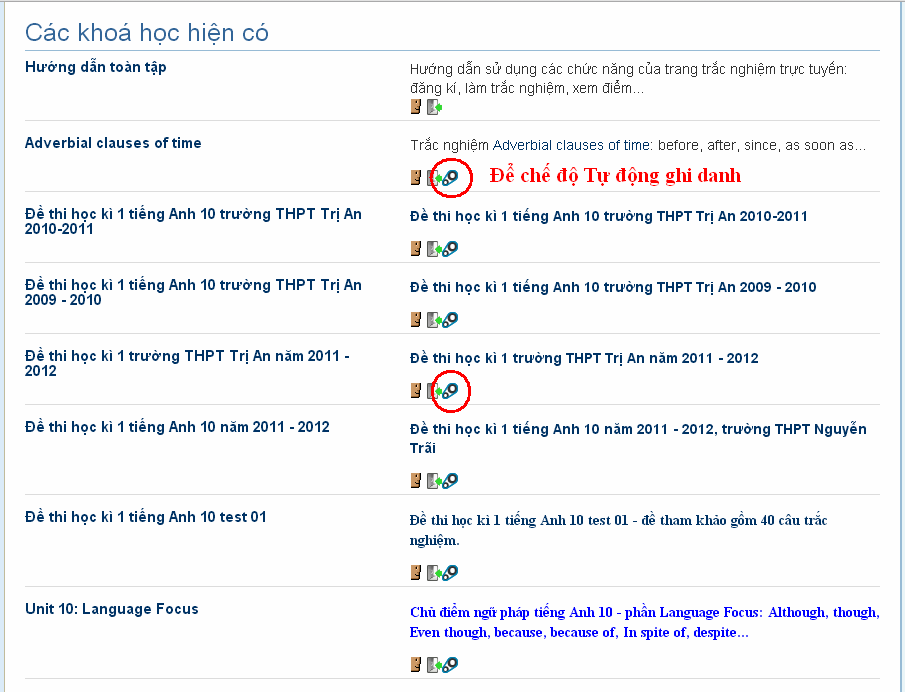- Khi tạo 1 khóa học hay 1 Quiz (bài trắc nghiệm), tiện ích này sẽ tự động Ghi danh các thành viên. Có 2 chế độ: khi đăng nhập vào trang web và click vào khóa học.